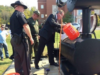 State Police Lt. Michael Baylous, Putnam Sheriff Steve Deweese and U.S. Attorney Booth Goodwin hoisted large orange buckets filled to the brim with a mixed assortment of pills and dumped them, one by one, into the smoking maw of the black incinerator Tuesday afternoon at the Putnam County Courthouse in Winfield.